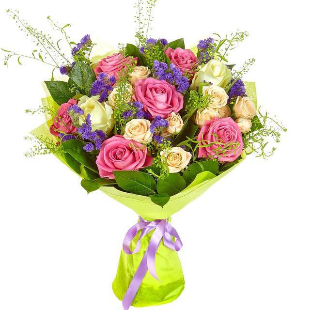 Композиция из одноголовых и кустовых роз – отличный способ продемонстрировать хорошее отношение и расположение, заботу и отсутствие корысти близкому человеку. Букет дополняют статицы и тласпи, придавая особенный шарм. Такое сочетание идеально для друзей или родственников, которым так хочется показать свою привязанность и признательность.